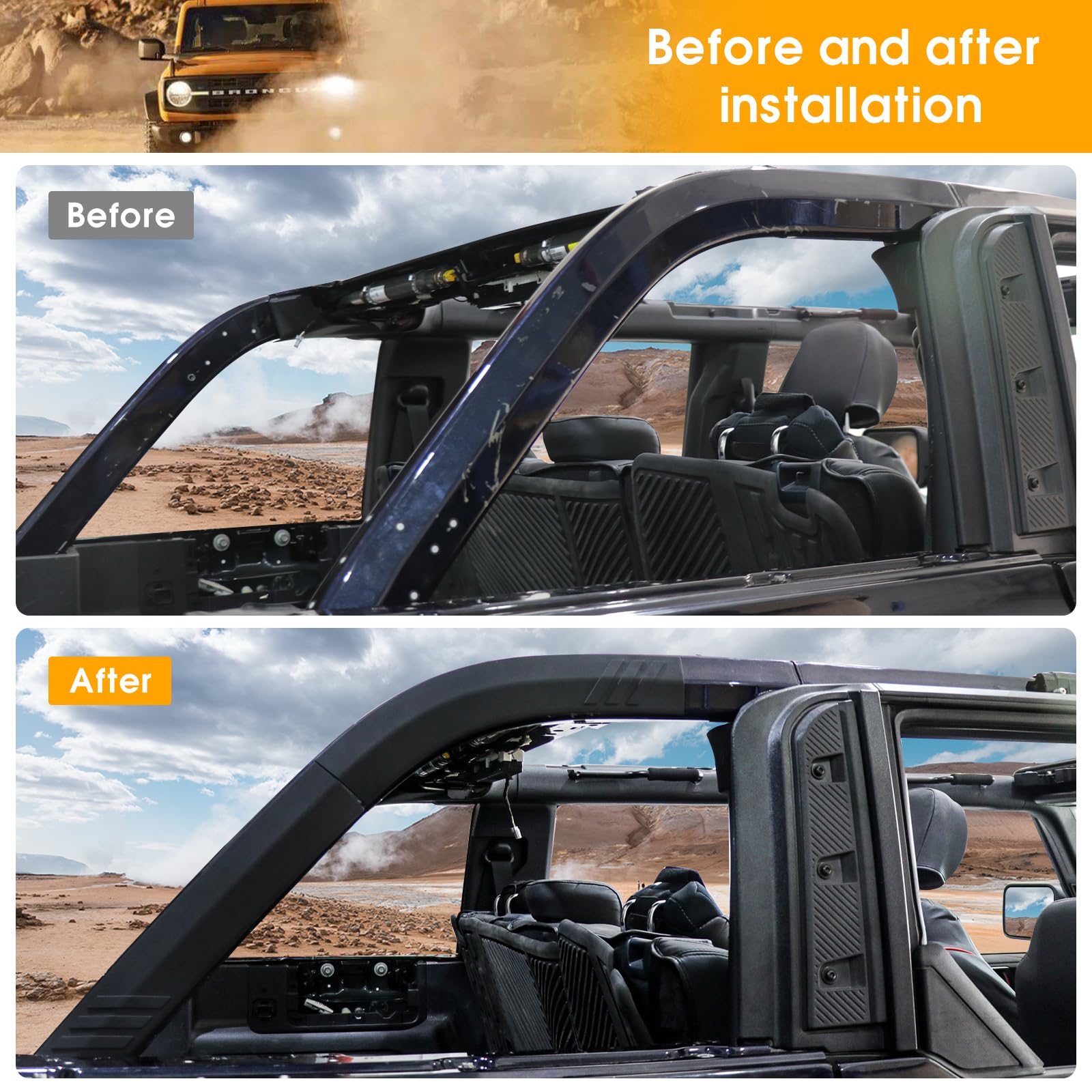 - 【 Customized Fitment 】The roll bar pad protective cover is compatible with for Ford Bronco 2021 2022 2023 2024 2025 2026 4-door (Not compatible with for Bronco 2 doors and Sports)