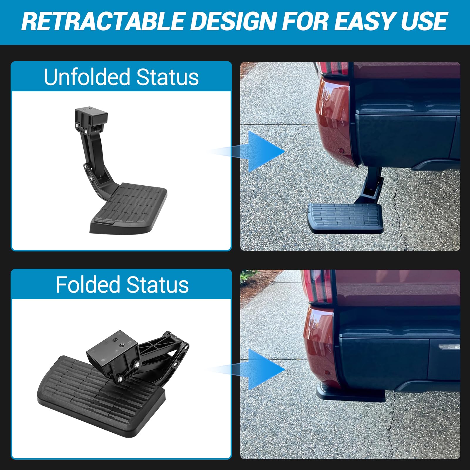 - 【MORE CONVENIENT】 The 2020 Toyota Tundra retractable bumper side tailgate step can easily solve the difficult problem of getting in and out of the trunk of the car. It is tucked under the rear bumper, providing you with an easier and more convenient way of loading and unloading.