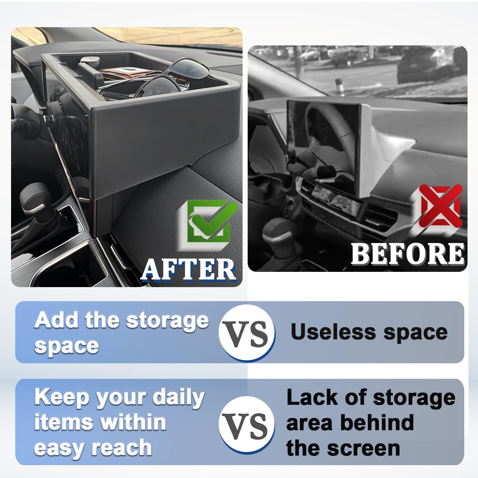 - [ No Tools, No Hassle ] Installs in seconds - just peel off the double-sided tape on the back and drop the Dash Insert Tray in. Designed to match your dashboard's curvature, making it feel like a built-in feature.