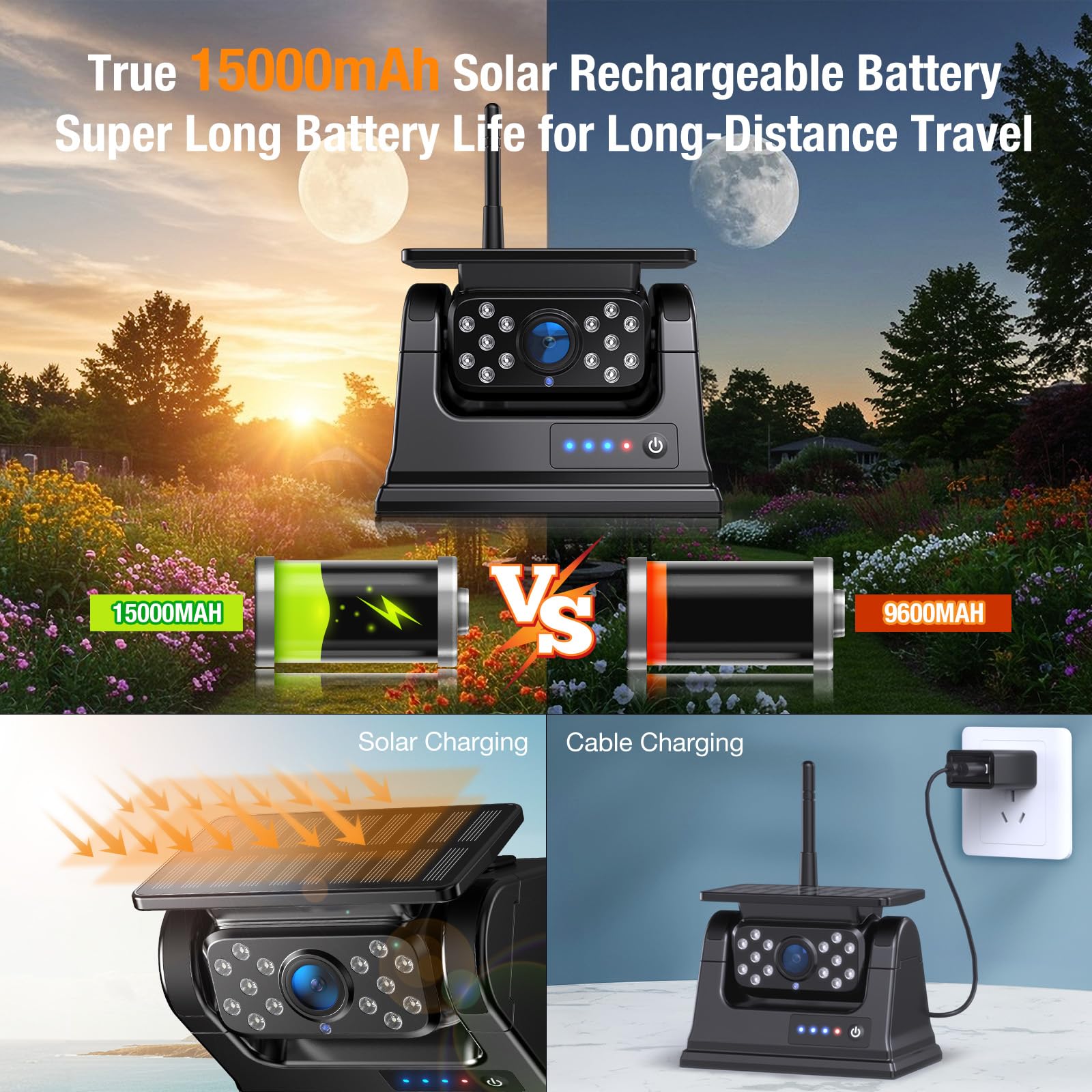 - 【Ultra-Long Battery Life】 The wireless rv backup camera is equipped with true 15000mAh high capacity rechargeable lithium-ion battery and monocrystalline silicon solar panel , supports Type-C charger and solar power in 2 ways. It takes 6 hours to fully charge the camera, and it can be used for 28hours, making it ideal for long road trips, camping, and frequent use.